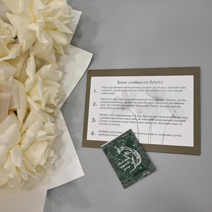 - Сроки возврата: Претензии по качеству букета принимаются в течение 24 часов с момента его получения.
