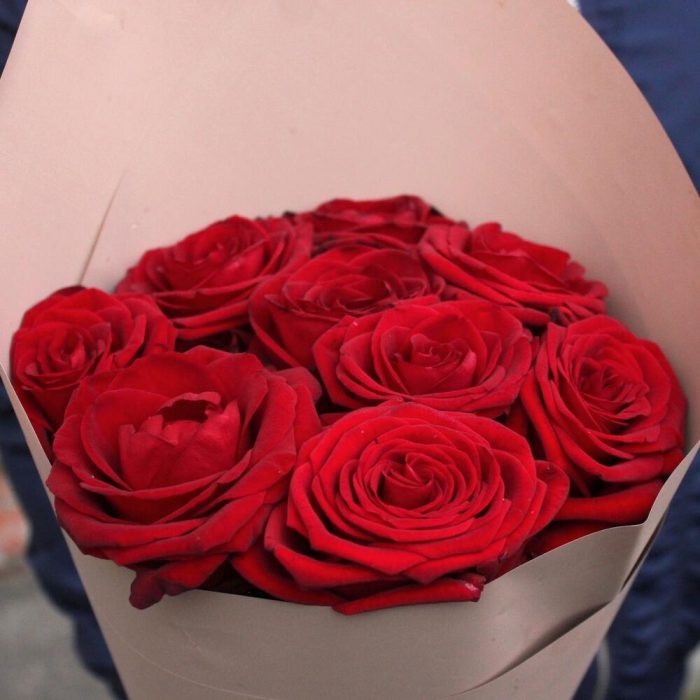 Роза красная – 9 шт.Лента атласная – 1 шт.упаковочный материал – 1 шт.