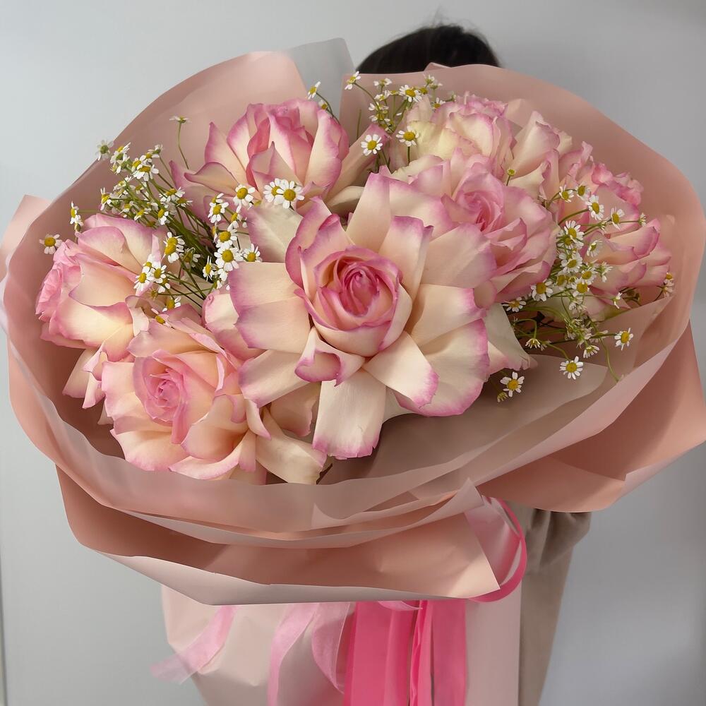 Букет из французских роз ,ромашек в дизайнерском оформлении