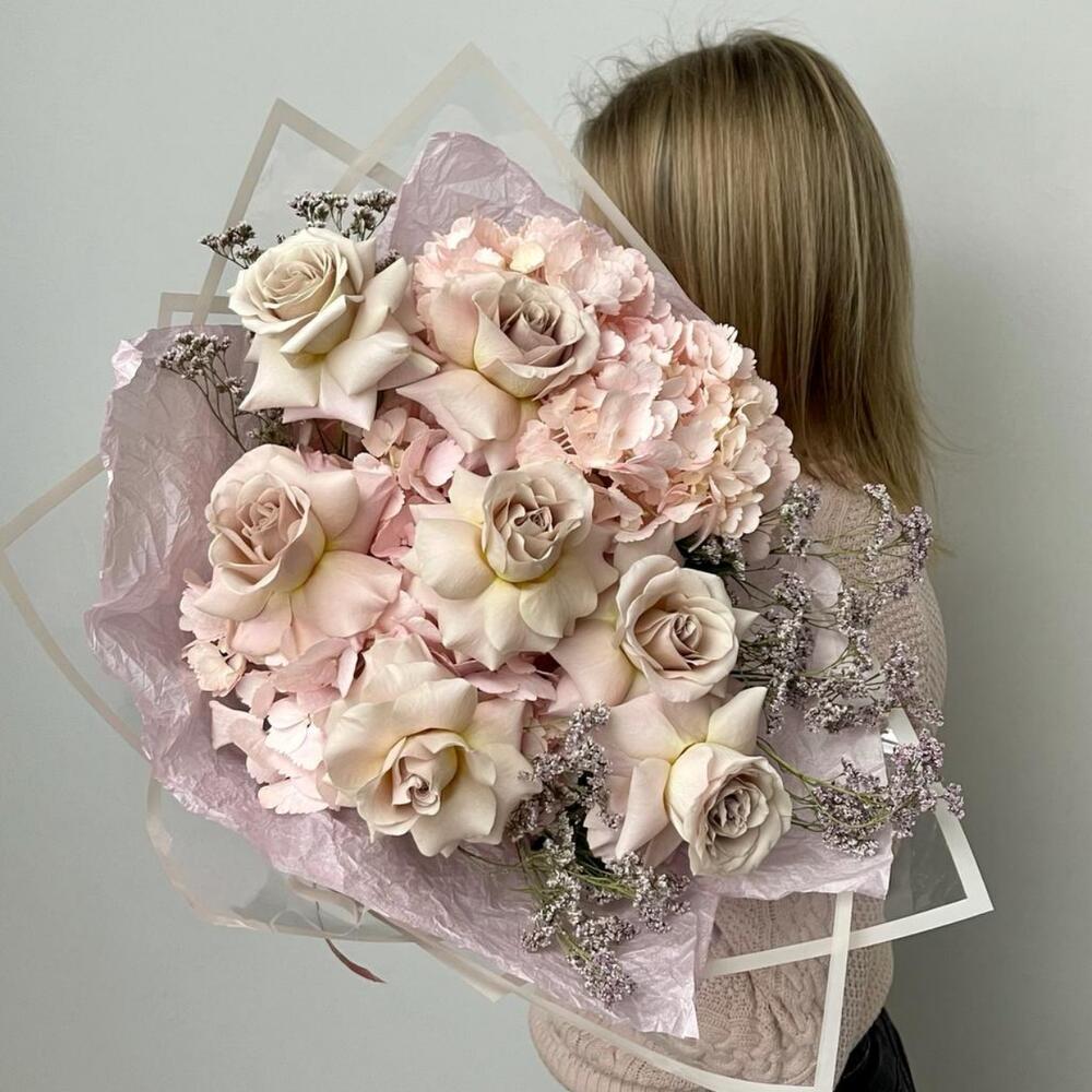 Гортензия – 2 шт.Лимониум – 2 шт.Роза – 7 шт.Упаковка дизайнерская – 4 шт.