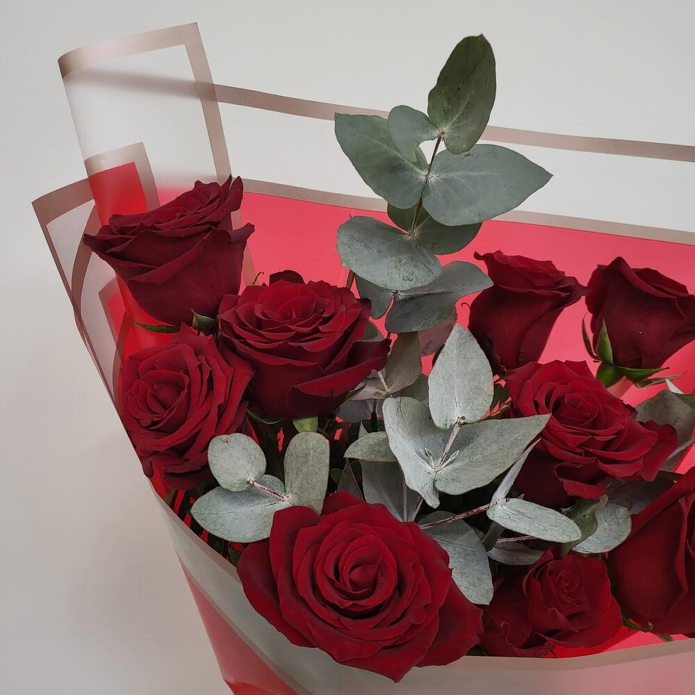 Роза красная – 9 шт.Эвкалипт – 2 шт.Упаковка дизайнерская – 1 шт.