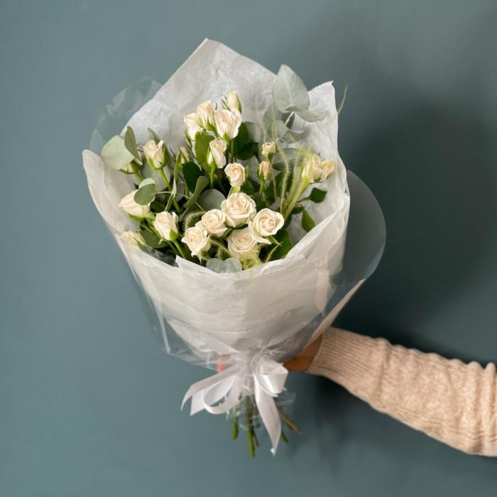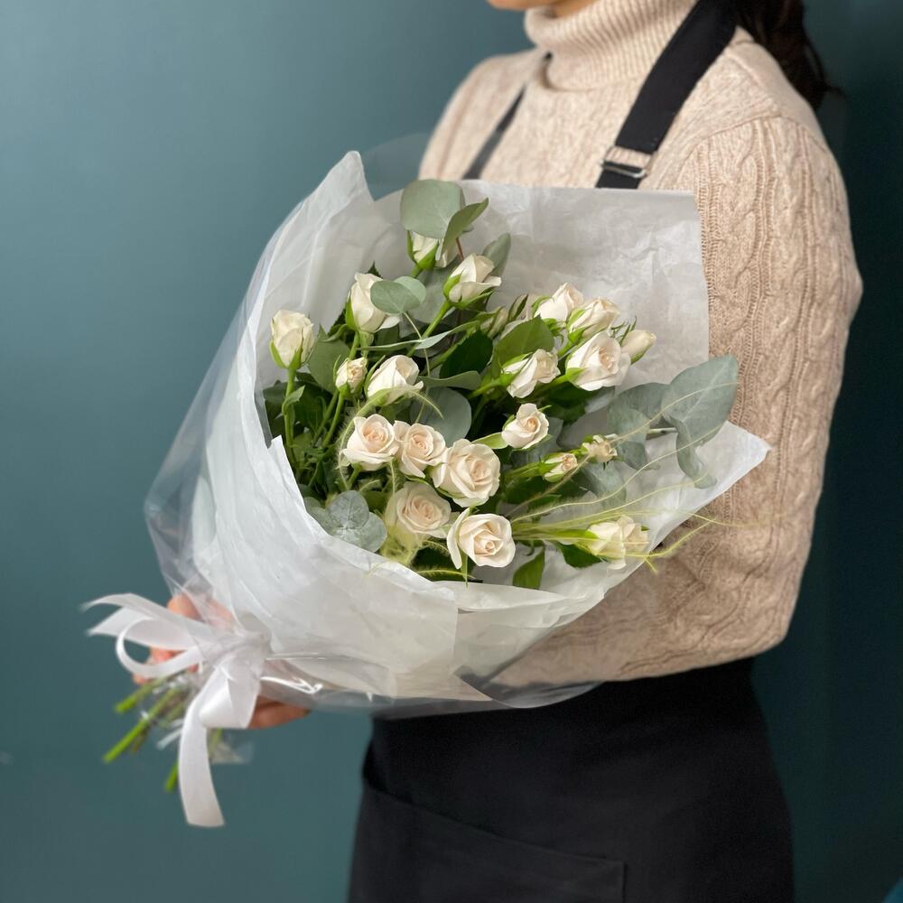 Роза кустовая – 7 шт.Эвкалипт – 1 шт.Ковыль – 1 шт.Упаковка дизайнерская – 1 шт.