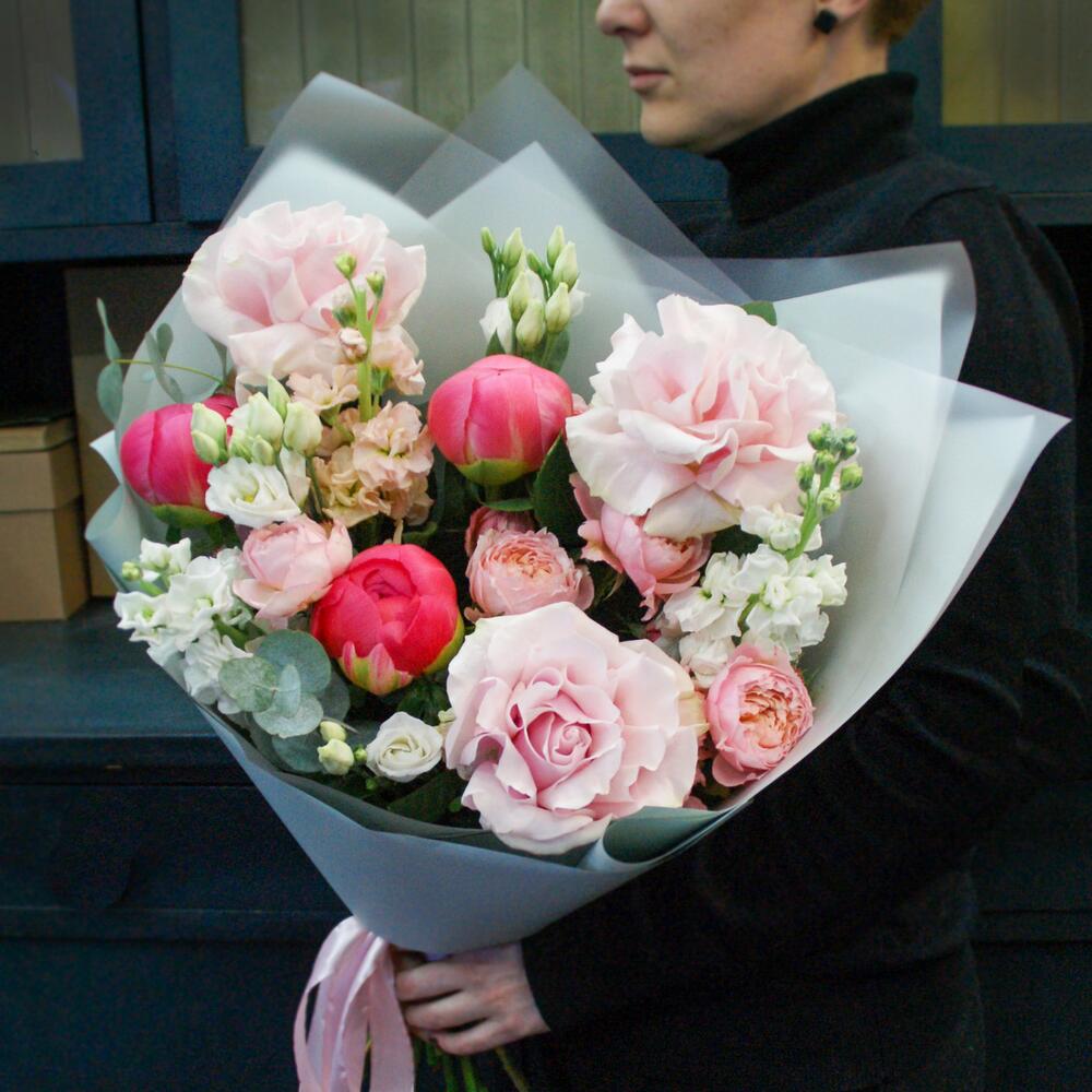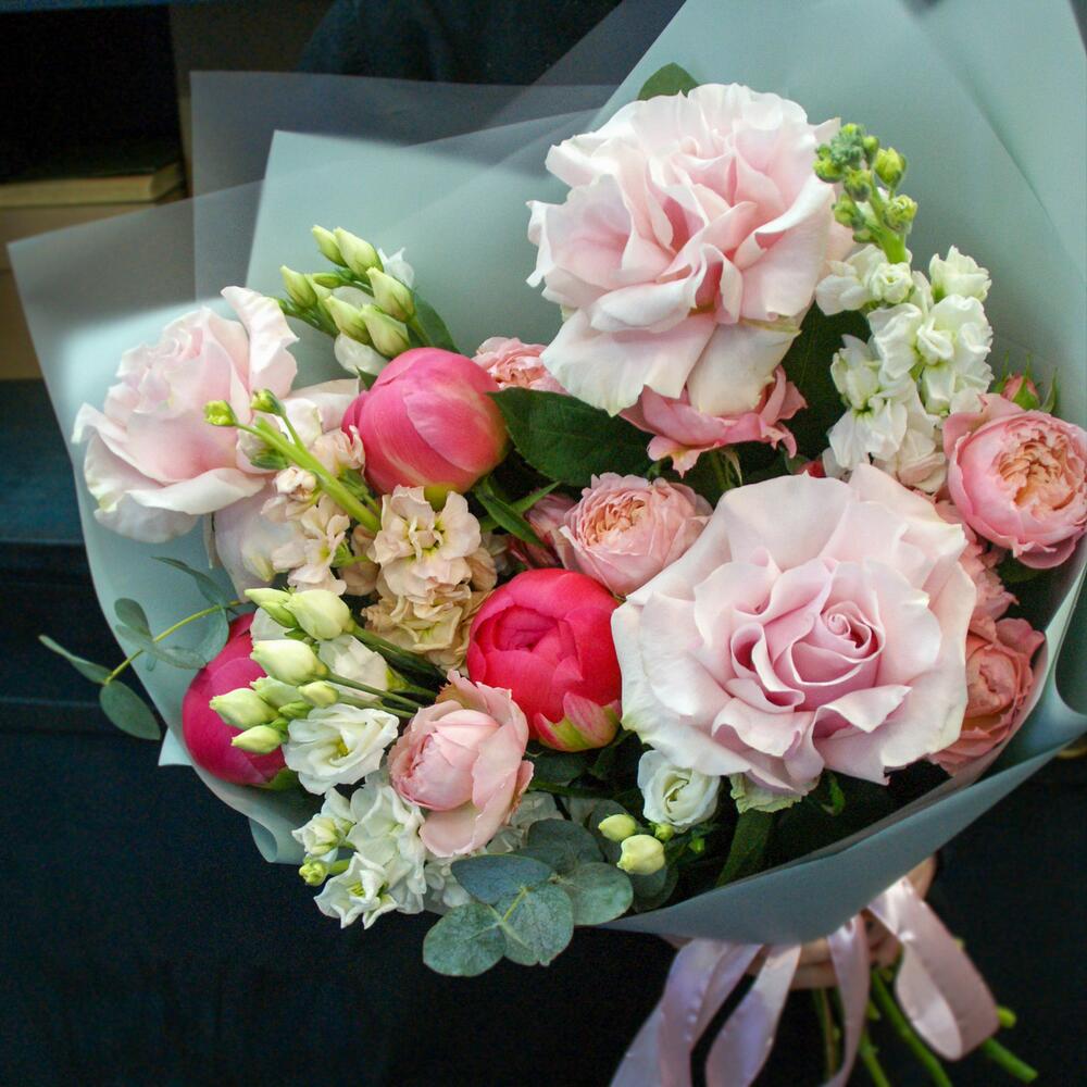 Букет из пионов и французских роз с маттиолой, эустомой (лизиантусом) и эвкалиптом