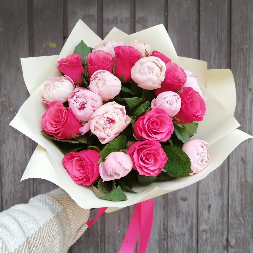 Пион sarah bernhardt – 11 шт.Роза 40 см – 10 шт.Упаковка матовая – 2 шт.Лента атласная – 1 шт.