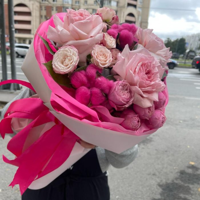 white o’hara – 3 шт.Кустовая роза – 7 шт.Пионовидная роза – 2 шт.Хлопок натуральный – 3 шт.Салал – 5 шт.Тишью – 4 шт.Пленка матовая – 1 шт.Лента атласная – 2 шт.