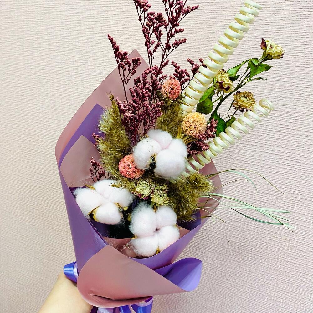 Скабиоза – 1 шт.Упаковка – 1 шт.Ковыль – 2 шт.Роза сухоцвет – 2 шт.Хлопок натуральный – 3 шт.Завиток – 2 шт.лимониум стабилизированный – 1 шт.