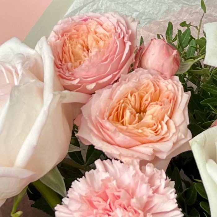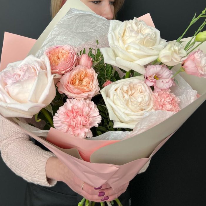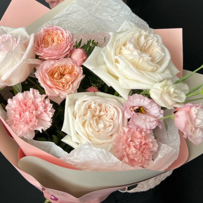 Эустома – 1 шт.Диантус – 2 шт.Фисташка – 3 шт.Пионовидная кустовая роза julliet – 1 шт.Дизайнерская упаковка – 3 шт.пионовидная роза white o’hara – 3 шт.