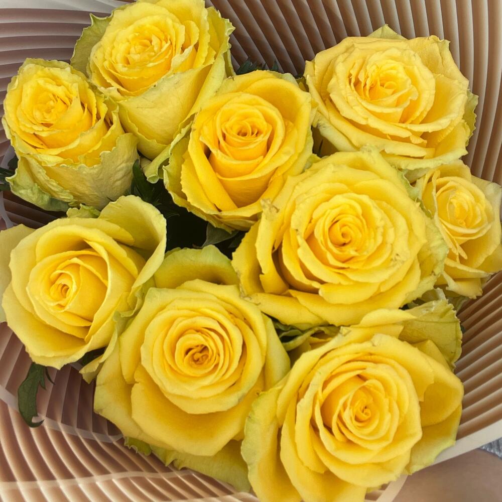 Упаковка – 1 шт.Лента атласная – 1 шт.Роза желтая 50 см – 9 шт.Открыточка с вашими пожеланиями – 1 шт.