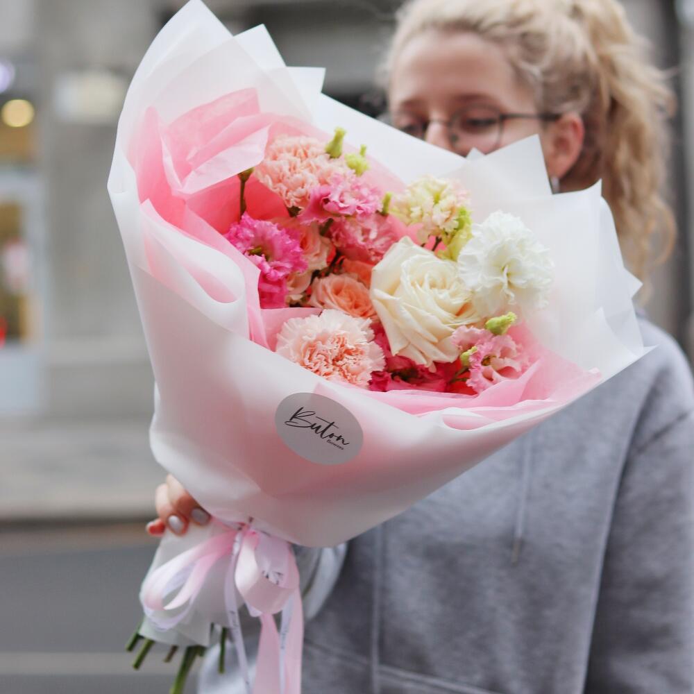 Лизиантус – 1 шт.Роза кустовая – 1 шт.Роза пионовидная – 1 шт.Гвоздика сортовая – 3 шт.Открыточка с вашими пожеланиями – 1 шт.Шоколадка – 1 шт.Дизайнерская упаковка – 1 шт.
