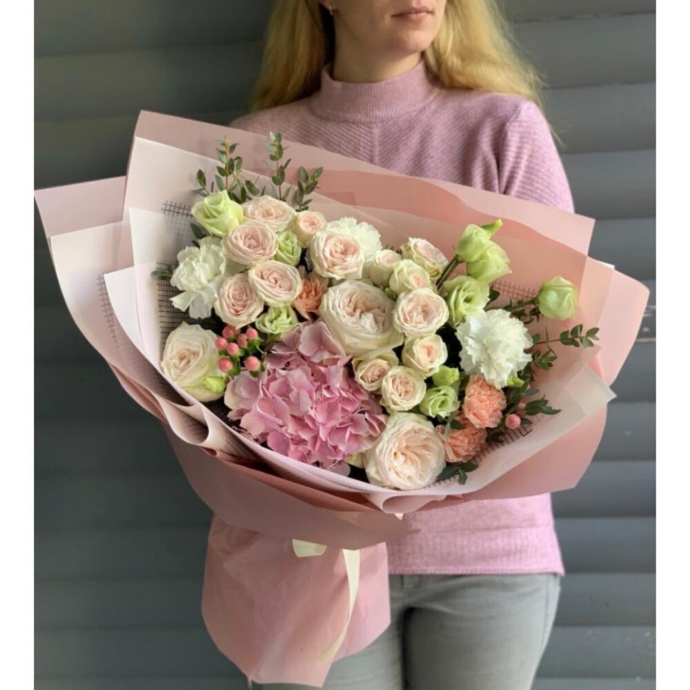 Гвоздики, Лизиантусы, Розы, Тюльпаны