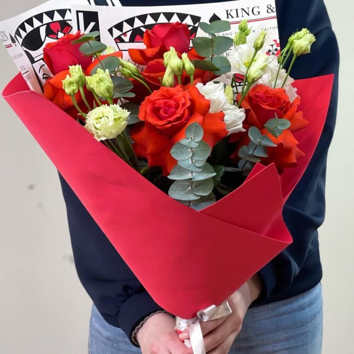 Роза Эквадор – 5 шт.Лизиантус Алиса белый – 4 шт.зелень декоративная – 1 шт.Упаковка дизайнерская – 1 шт.