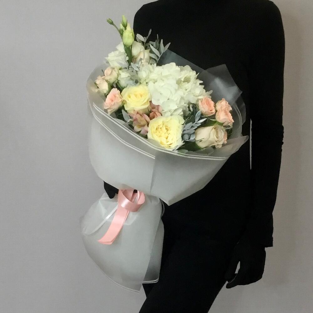 Альстромерия – 1 шт.Гортензия – 1 шт.Кустовая роза – 2 шт.Эустома – 1 шт.Лента атласная – 1 шт.Фисташка – 2 шт.Пленка матовая – 2 шт.роза шарман – 2 шт.роза кендлайт эквадор – 2 шт.