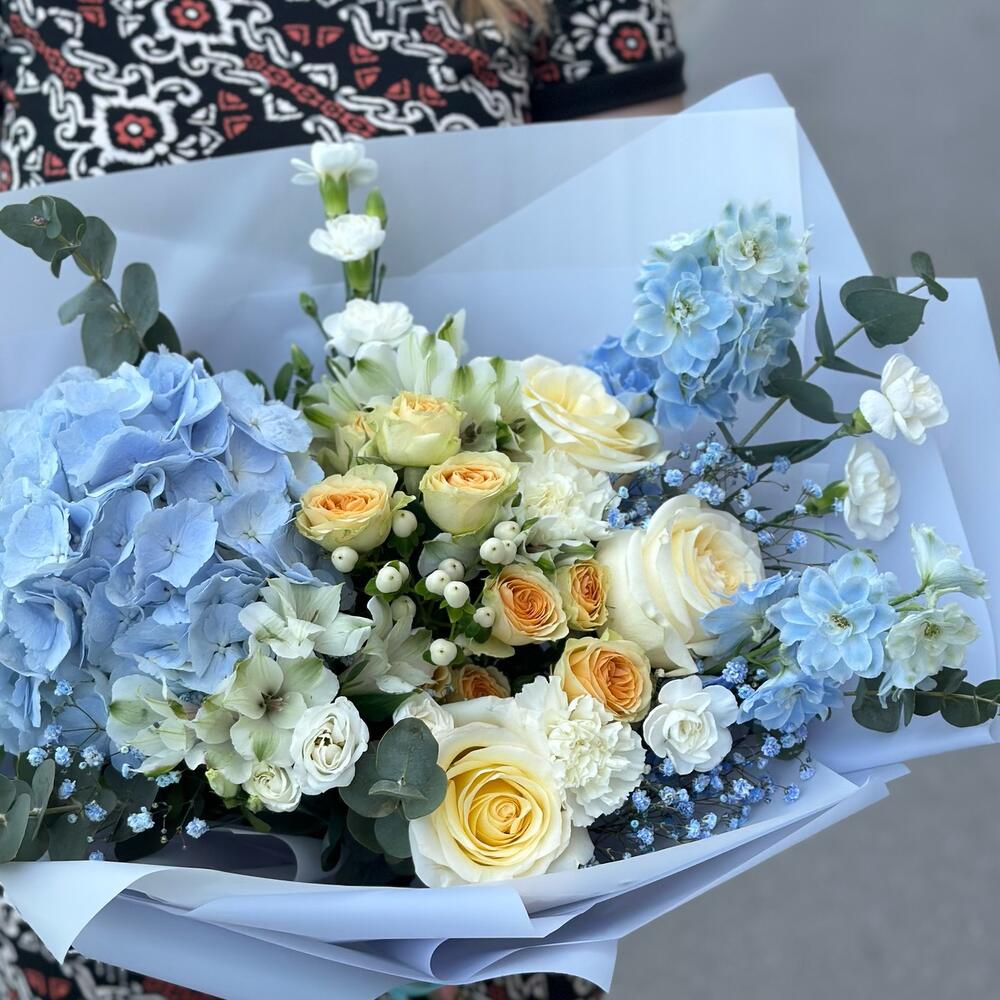 Гортензия голубая – 1 шт.Роза кустовая – 3 шт.Роза Эквадор – 3 шт.Альстромерия – 3 шт.Дельфиниум голубой – 2 шт.Диантус кустовой – 3 шт.Диантус сортовой – 3 шт.лизиаетус – 1 шт.Гиперикум – 1 шт.Гипсофила – 3 шт.Эвкалипт – 3 шт.Фисташка – 3 шт.Упаковка дизайнерская – 3 шт.Лента атласная – 1 шт.