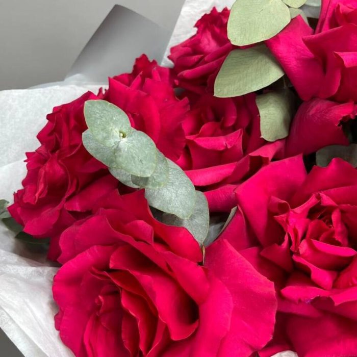 Букет с малиновыми розами и эвкалиптом