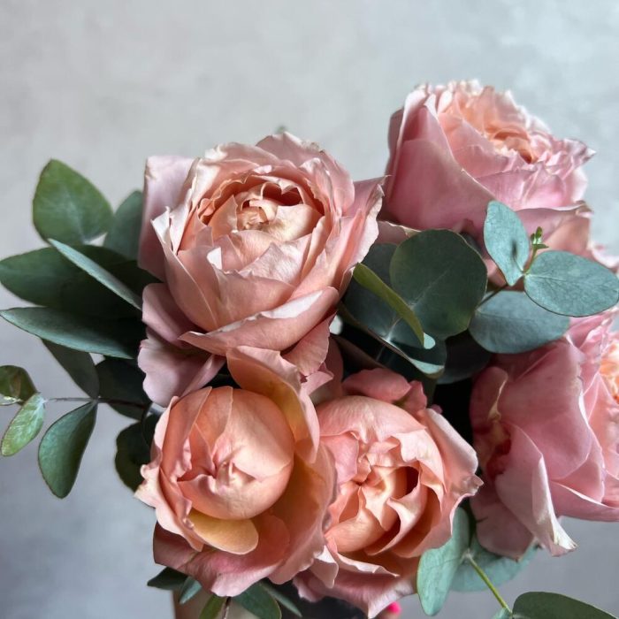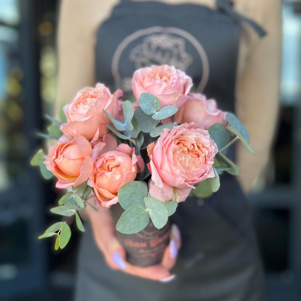 Стакан – 1 шт.Флористическая губка (оазис) – 1 шт.джульетта роза пионовидная – 1 шт.Эвкалипт – 2 шт.