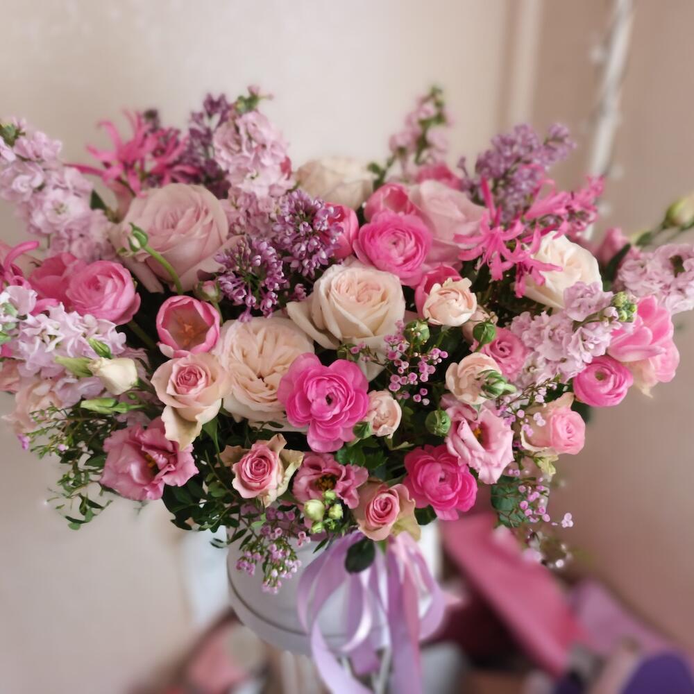 Цветы в коробке с пион розами,сиренью,ранункулюсами,эустомой,тюльпанами,матиолой,пионовидными кустовыми розами