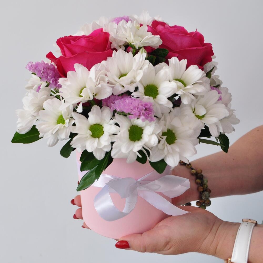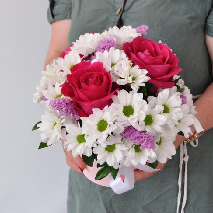 Хризантемы ромашки с розами в коробке «Мамина любовь»