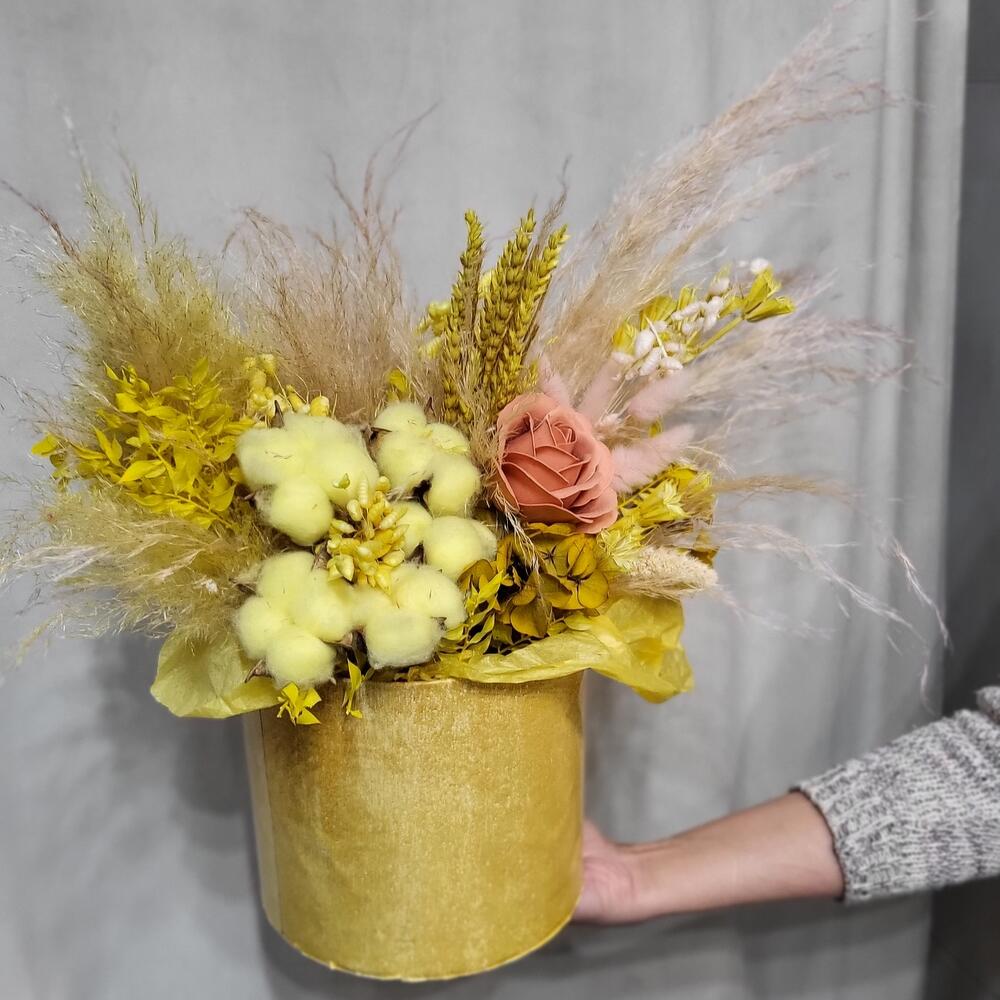 Хлопок – 5 шт.кортадерия ( бежевая ) – 2 шт.Аспарагус – 1 шт.Лагурус – 15 шт.Гортензия – 1 шт.Шляпная коробка – 1 шт.Оазис флористический – 1 шт.Мыльная роза – 1 шт.