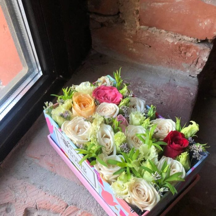 Роза – 3 шт.Роза кустовая – 3 шт.Эустома – 1 шт.декоративная зелень – 3 шт.Оазис – 1 шт.Коробка – 1 шт.
