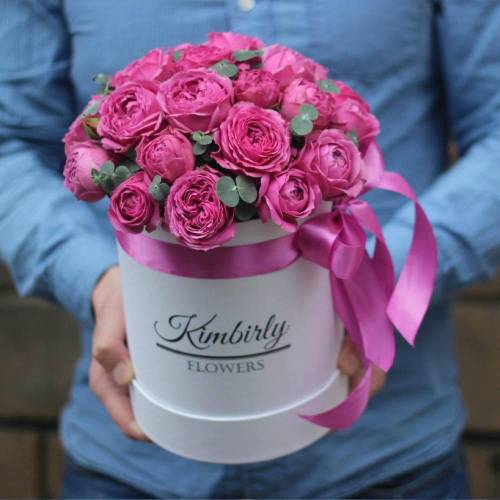 Роза кустовая пионовидная – 7 шт.Эвкалипт – 3 шт.Оазис флористический – 2 шт.Шляпная коробка – 1 шт.
