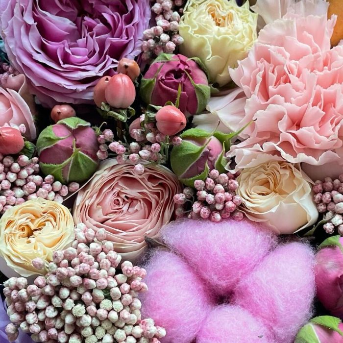Гиперикум – 1 шт.Хлопок – 1 шт.Кустовая роза – 3 шт.Гвоздика – 1 шт.Коробка шляпная – 1 шт.Оазис флористический – 1 шт.макарон (пирожное) – 4 шт.райз – 1 шт.