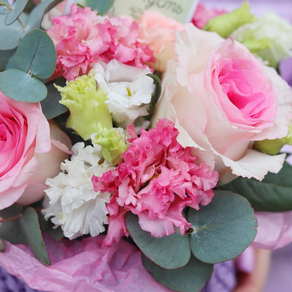 кашпо вязанное ручной работы – 1 шт.эустома кружевная – 1 шт.Роза пионовидная – 3 шт.Эвкалипт – 3 шт.Открыточка с вашими пожеланиями – 1 шт.