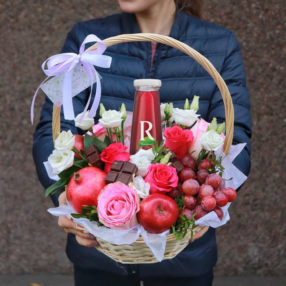 Сок в стекле – 1 шт.яблоки – 3 шт.Гранат – 1 шт.шоколад риттер спорт с фундуком – 1 шт.Виноград гроздь – 1 шт.Роза – 5 шт.Эустома – 3 шт.Корзина плетеная – 1 шт.Открытка – 1 шт.Прозрачная пленка – 1 шт.