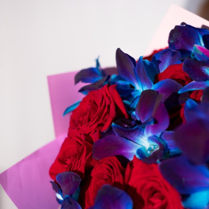 Космические орхидеи с красными розами. Букет 141 ALMOND ROSES