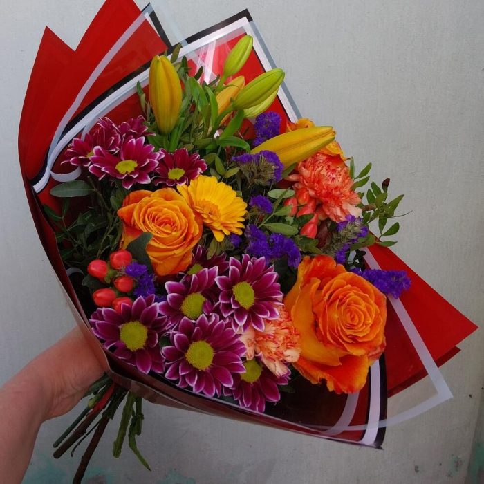 Гербера мини – 1 шт.Фисташка – 10 шт.Гвоздика сортовая – 1 шт.Упаковка дизайнерская – 3 шт.Хиперикум красный – 2 шт.Азиатская лилия – 1 шт.хрищате кустовая – 2 шт.салантай роза – 3 шт.