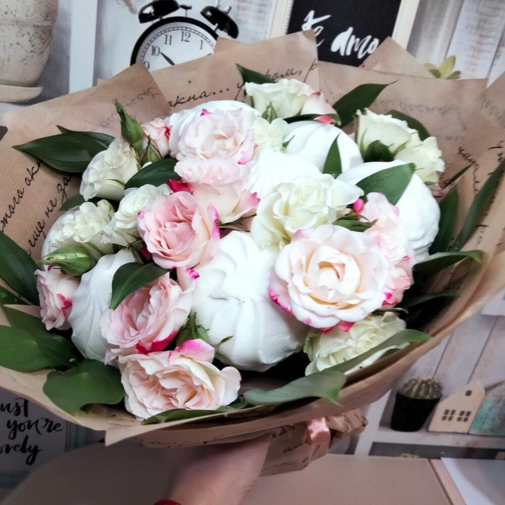 Зефир – 12 шт.Роза кустовая – 2 шт.зелень натуральная – 1 шт.