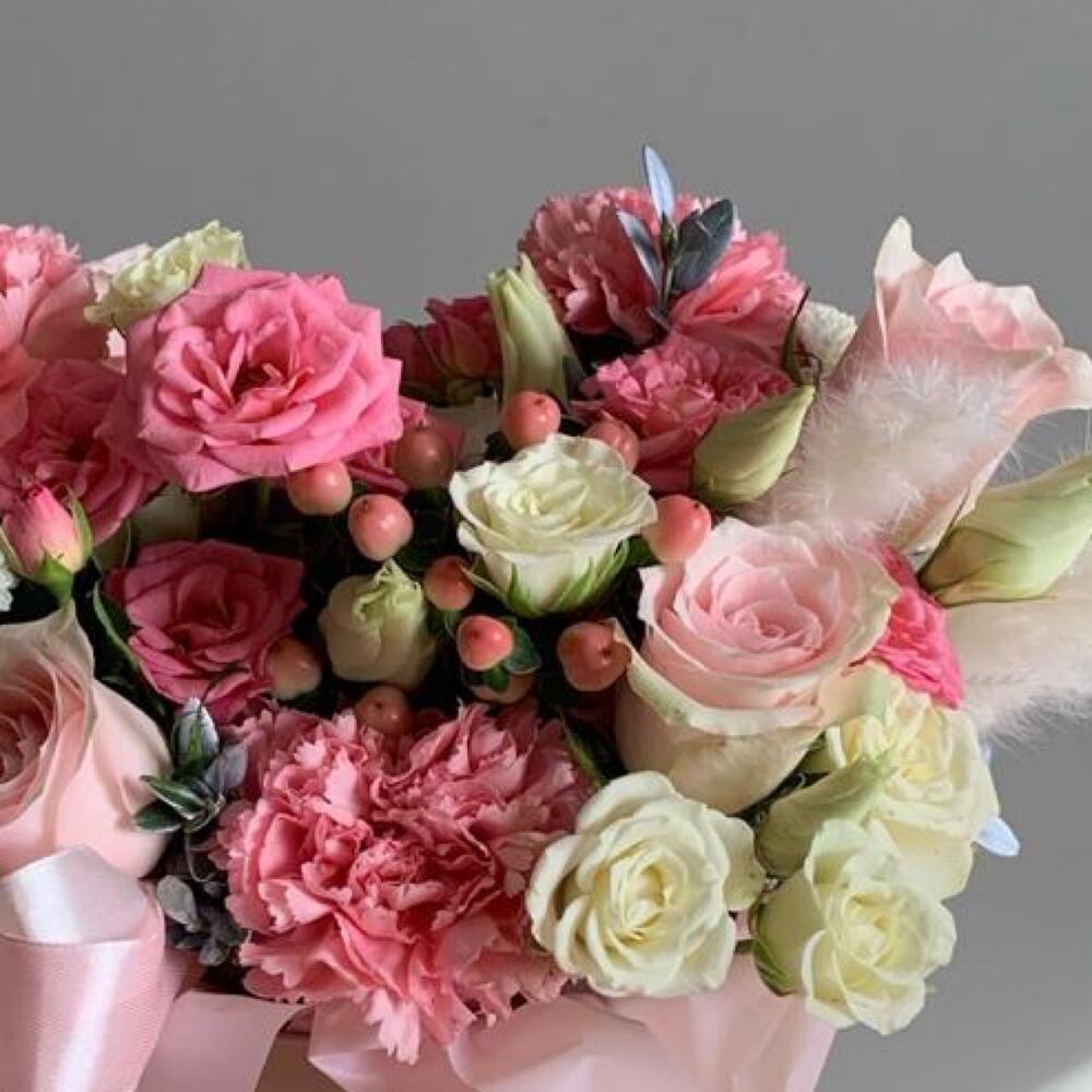 Диантус – 3 шт.Роза пионовидная кустовая – 3 шт.Роза – 5 шт.Эустома – 1 шт.Гиперикум – 2 шт.Фисташка – 1 шт.Шляпная коробка – 1 шт.