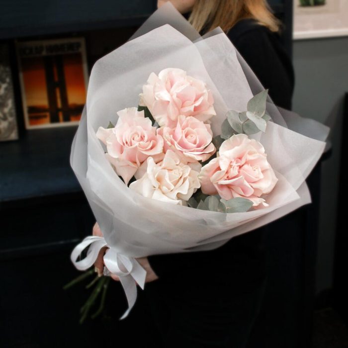 Нежный букет из 5 французских роз с эвкалиптом