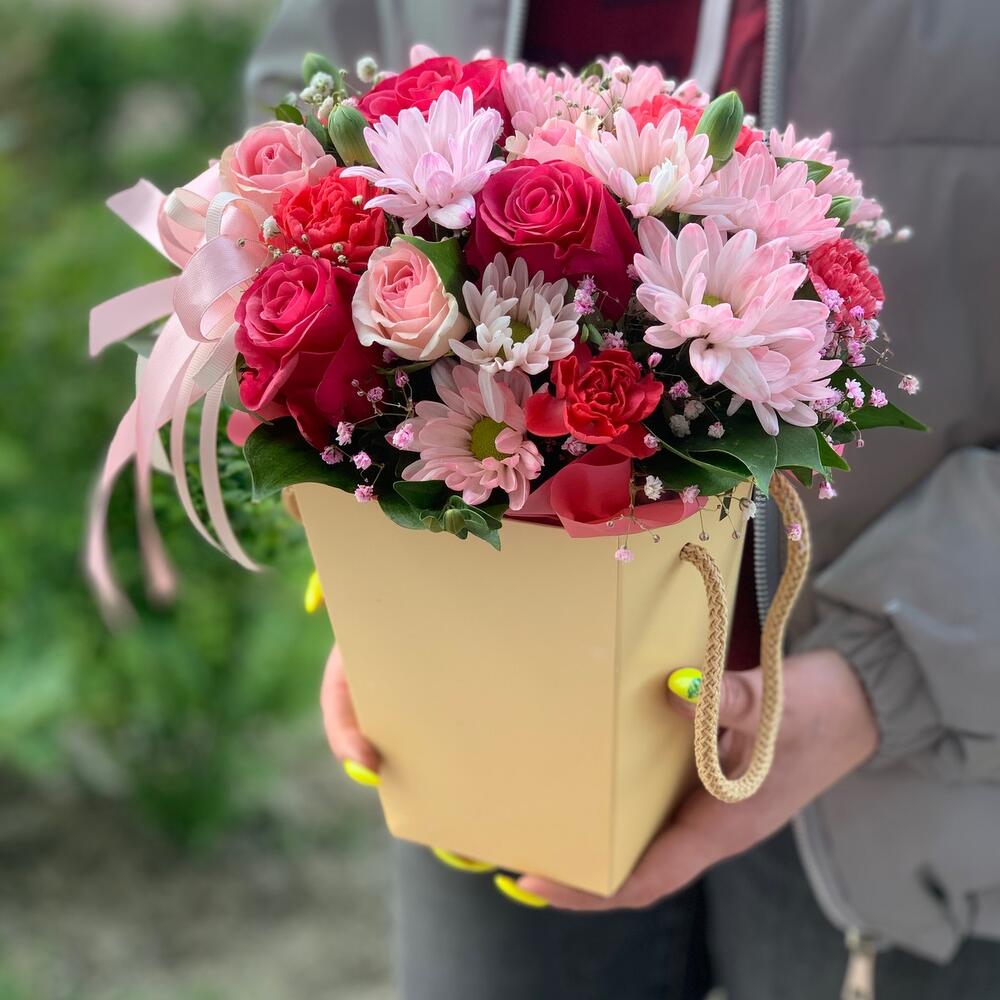 Гипсофила – 1 шт.Роза кустовая – 2 шт.Хризантема кустовая – 3 шт.Роза – 3 шт.Коробка – 1 шт.зелень декоративная – 5 шт.