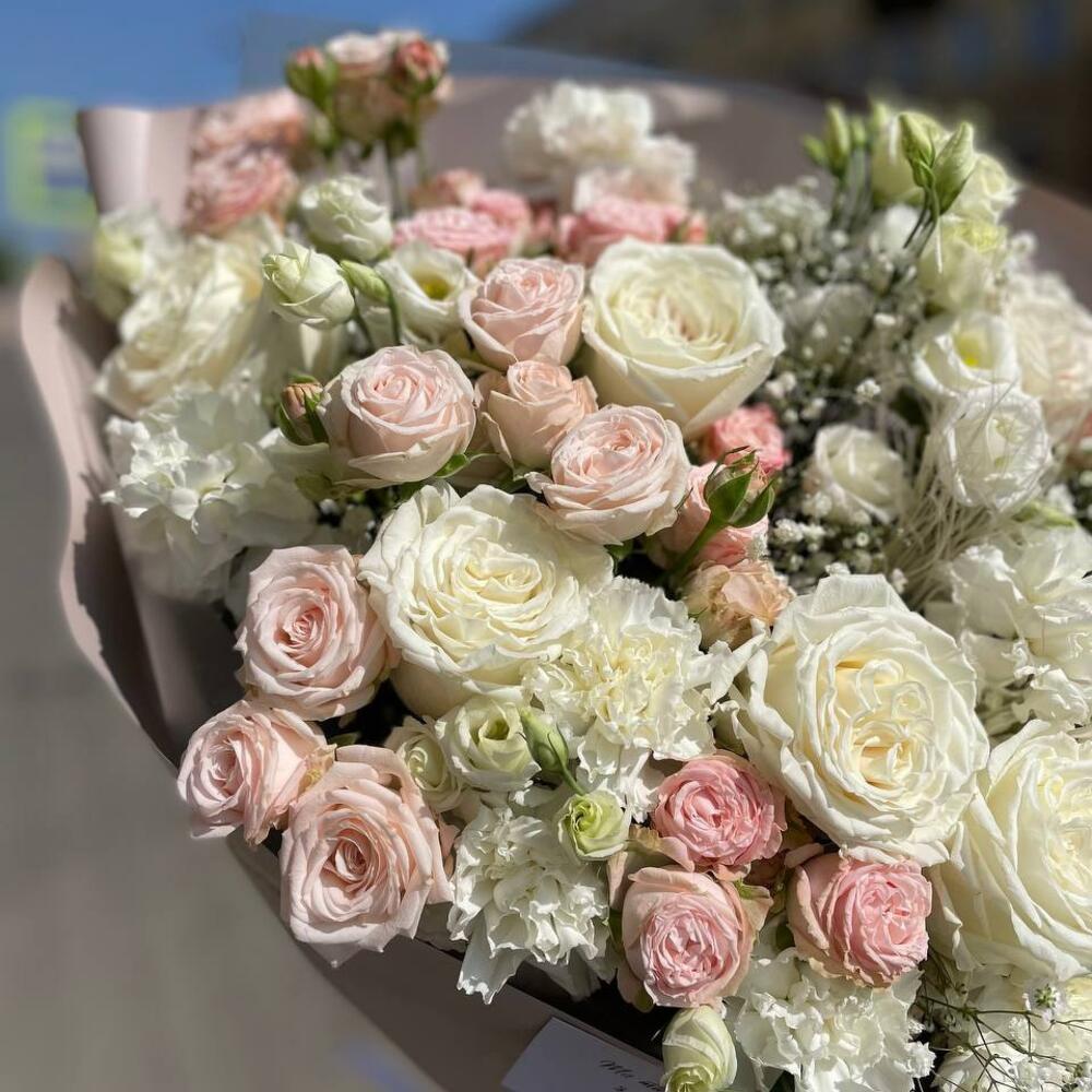 Нежный букет, большого размера в составе с лизиантусами, кустовыми и одноголовыми розами.