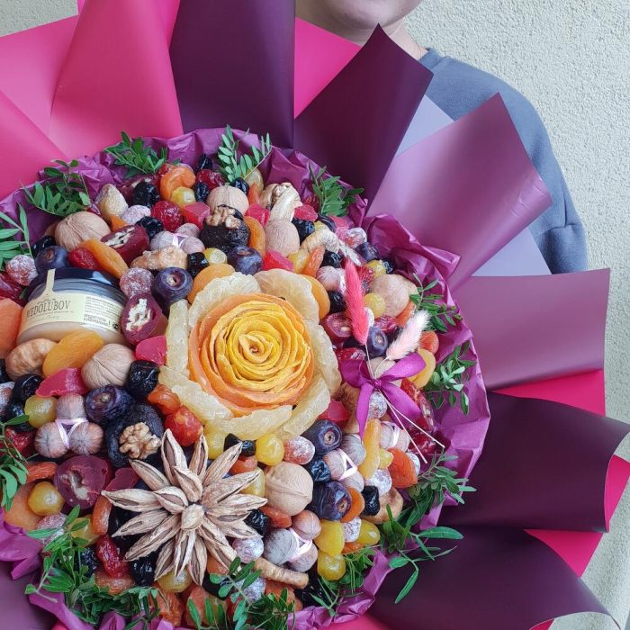 Премиальный букет из сухофруктов , орехов и крем меда. У ваших друзей намечается юбилей или значимое торжество , хотите удививить и впечатлить – эта модель букета то, что нужно для получения восторгов , улыбок и слов удивления !!!Букет упаковывывается в пленку слюду … Показать ещёи доставляется в транспортировочной коробке.