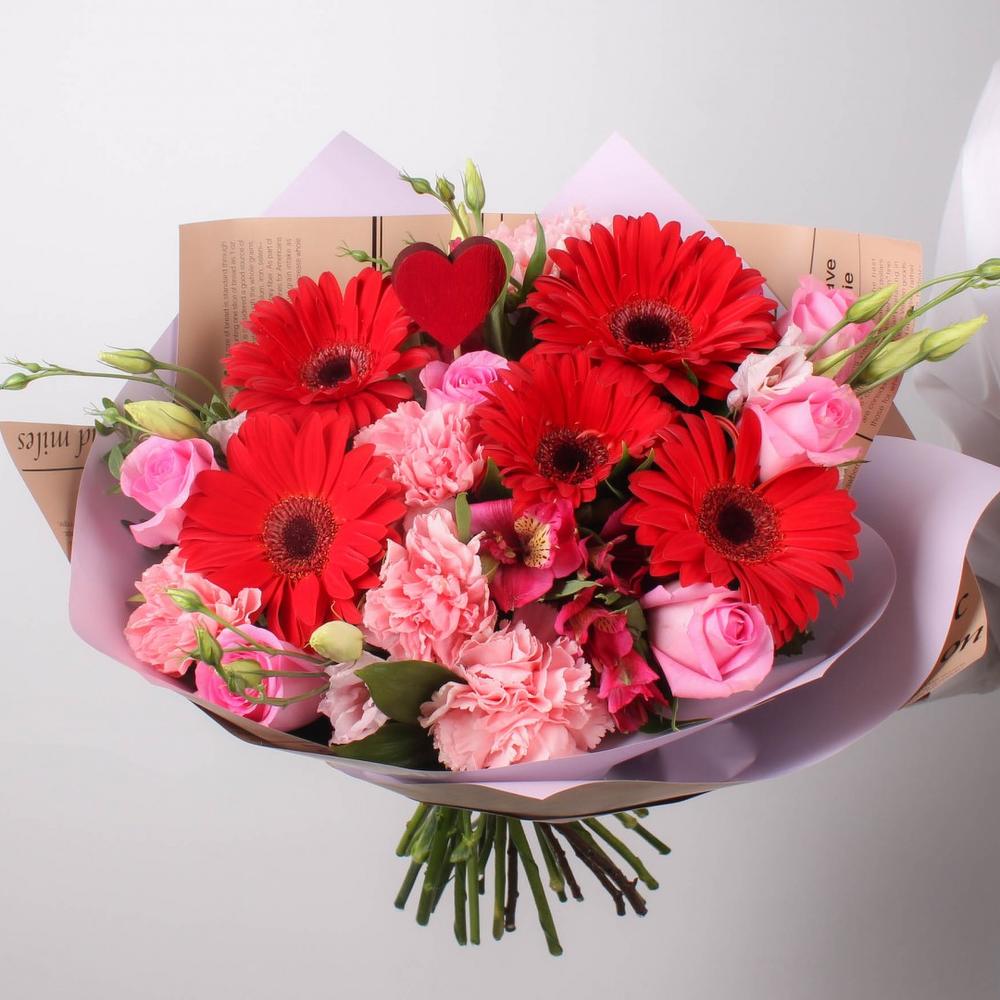 Гербера – 5 шт.Роза – 5 шт.Эустома – 3 шт.Гвоздика – 5 шт.Топпер деревянный – 1 шт.Упаковка дизайнерская – 2 шт.