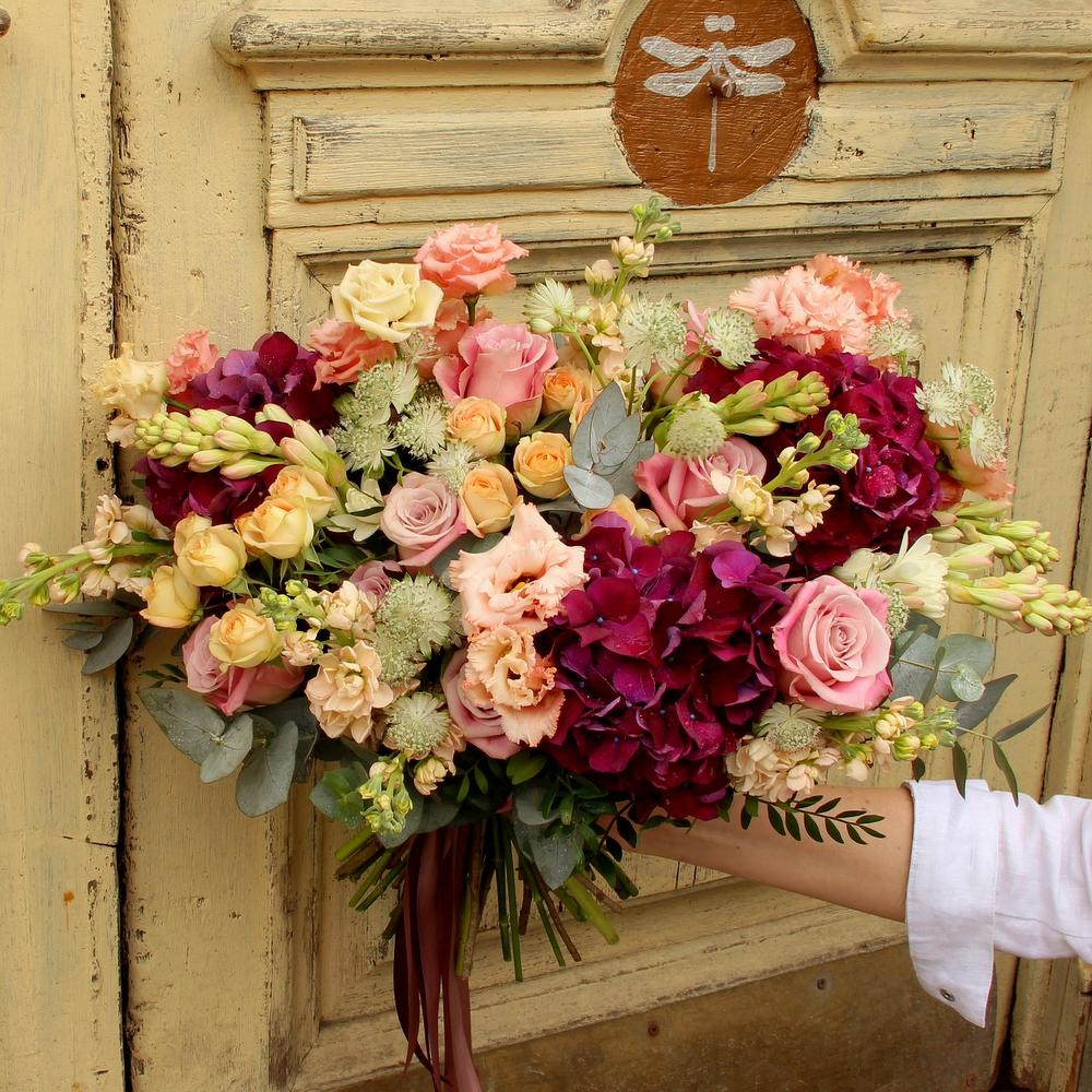 Раскидистый букет с гортензиями, эустомой, розами, маттиолой и эвкалиптом.Стильное цветочное решение для любого случая.Ширина букета около 60 сантиметров, высота букета около 60 сантиметров.