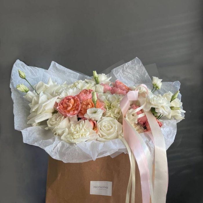 Гортензия – 2 шт.джульетта роза пионовидная – 3 шт.Лизиантус – 2 шт.гвоздики – 5 шт.playa blanca – 7 шт.Упаковка дизайнерская – 2 шт.Лента атласная – 3 шт.