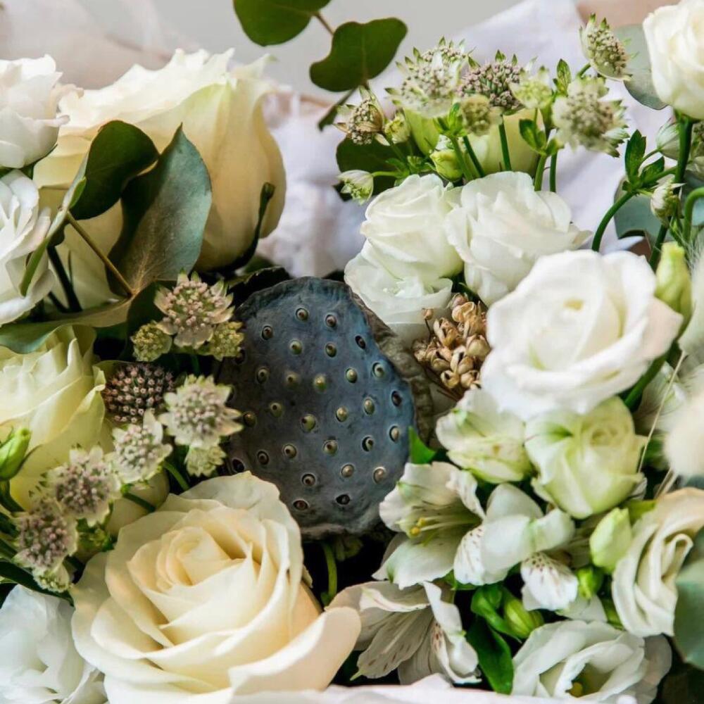 Альстромерия – 2 шт.Лизиантус – 4 шт.Лимониум – 1 шт.Эвкалипт – 3 шт.Зелень – 3 шт.Сухоцветы – 3 шт.Упаковка дизайнерская – 1 шт.Нелумбо – 1 шт.Роза Мондиаль – 3 шт.Астранция – 1 шт.