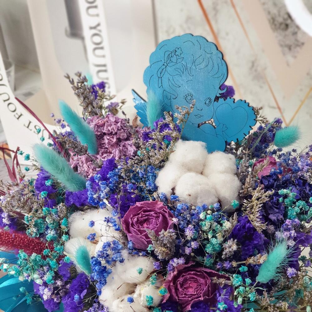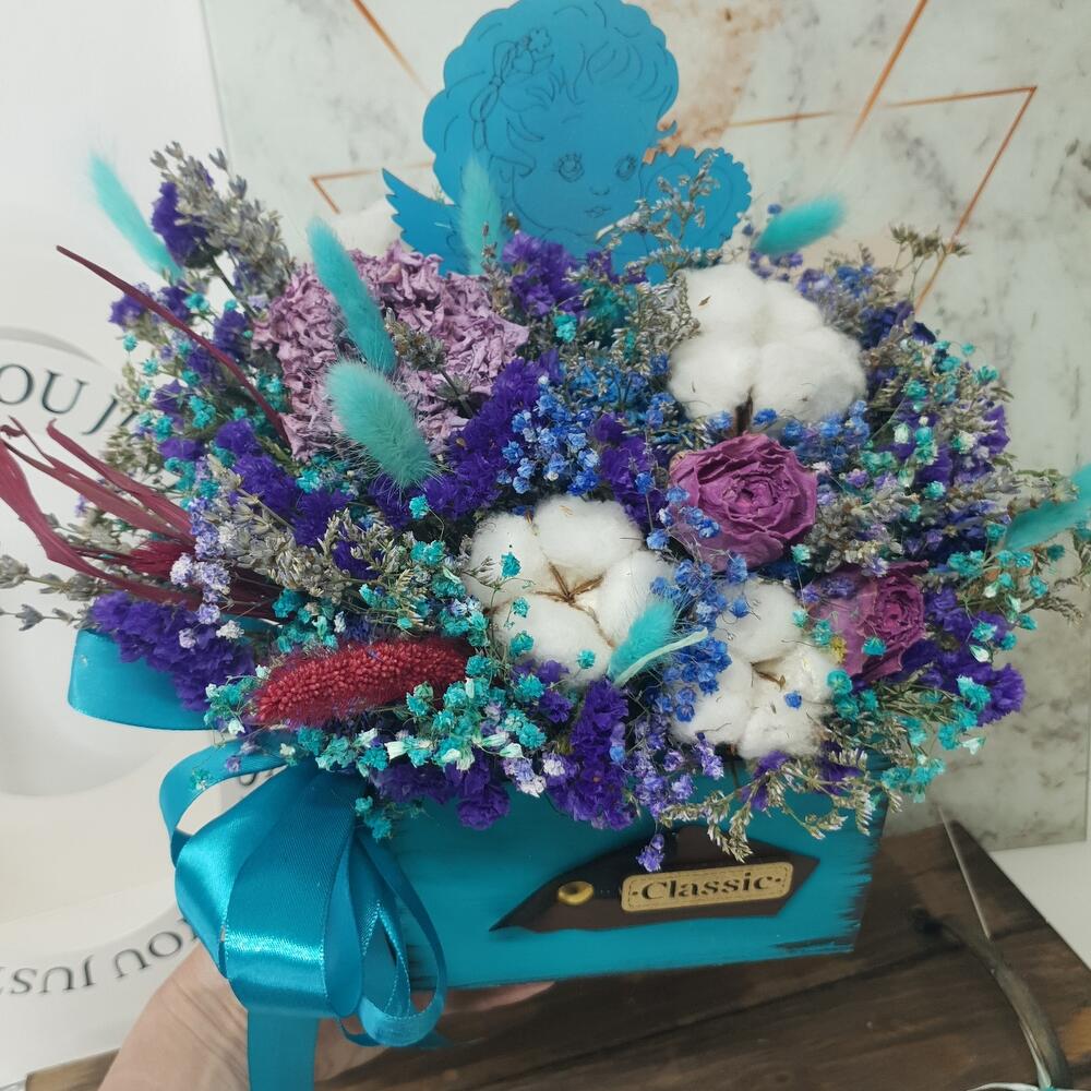 Ящик деревянный – 1 шт.Лаванда (сухоцвет) пучок – 1 шт.Хлопок натуральный – 4 шт.лимониум сухоцвет – 2 шт.лагурус (сухоцвет) пучок – 1 шт.гипсофила сухоцвет ветка – 4 шт.статица синяя сухоцвет – 4 шт.топпер деревянный ангел – 1 шт.