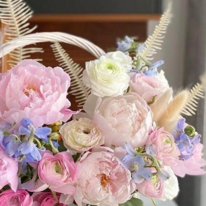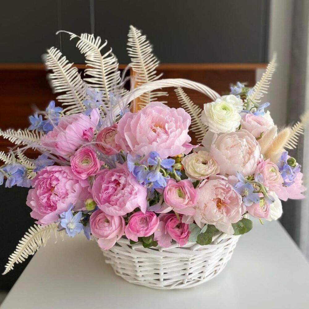 Пион – 7 шт.Листья папоротника – 9 шт.рануекулюс – 13 шт.Дельфиниум – 9 шт.Сухоцветы – 3 шт.Корзина плетеная – 1 шт.Оазис – 1 шт.Лента атласная – 2 шт.Открыточка с вашими пожеланиями – 1 шт.хорошее настроение – 100 шт.инструкция по уходу за цветами – 1 шт.Кризал – 1 шт.