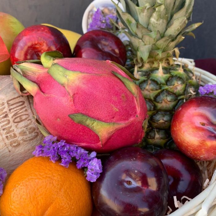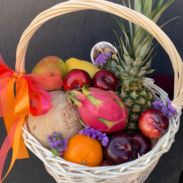 Ананас – 1 шт.Сухоцветы – 5 шт.Яблоко – 3 шт.Мандарин – 3 шт.Корзина плетеная – 1 шт.манго – 1 шт.Помело – 1 шт.Кокос – 1 шт.Слива красная – 5 шт.Драгон фрукт – 1 шт.финики 150 гр – 1 шт.