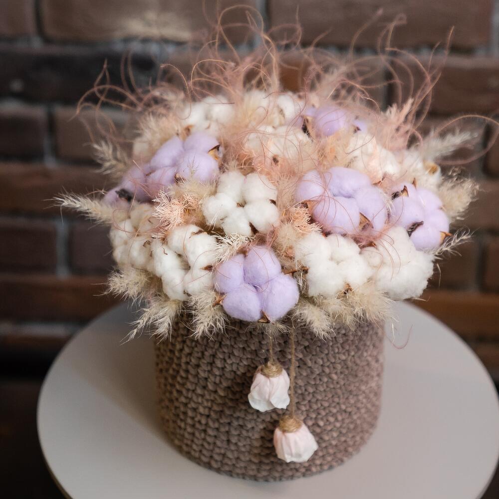 Хлопок натуральный – 25 шт.Ковыль – 30 шт.аспарагус стабилизированный – 5 шт.Шляпная коробка – 1 шт.обвязка ручной работы – 1 шт.